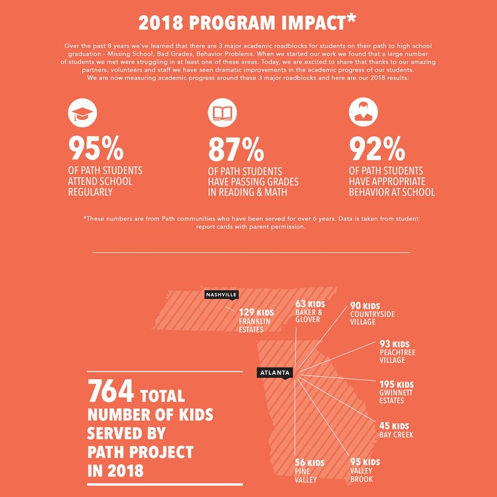 The project's recent stats speak to its success. According to The Path Project's 2018 annual report, 100% of the 4th and 5th graders in the project's first community are on track academically (using United Way metrics on grades, behavior, and attendance). Between 2011 and 2016, graduation rates jumped from 35% to 88%, and around 90% of students in that mobile park are currently on track to graduate—an improvement of 100% in the past four years.