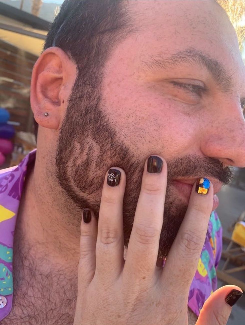 At this moment, though, I'm showing my face proudly to a woman wearing a swimsuit with a taco cat on it. We have only recently met, but she's telling me that she's so into my "fade" that she wants to kiss it. Then she does, blowing a raspberry into my cheek so hard that her hat falls off. Neither of us can stop laughing.
