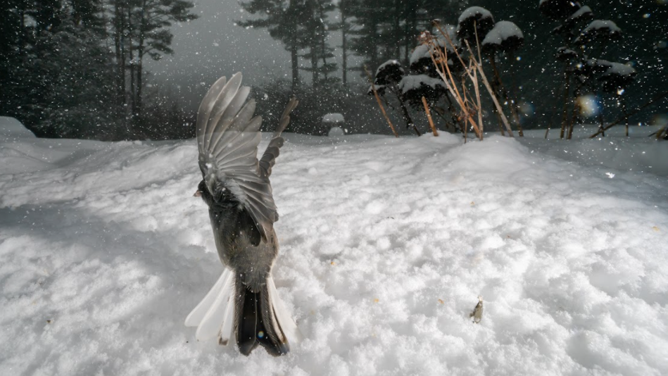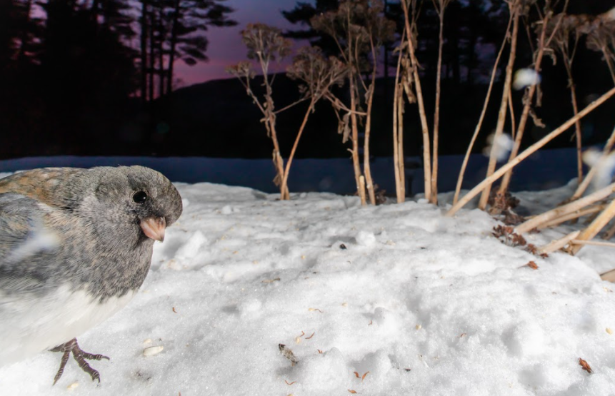 “Often overlooked and considered drab ground-feeding birds, Dark-Eyed Juncos hold a special place in my heart due to their funny and curious behaviors. Every day they were first to arrive beneath the bird feeder,” Rhodes says. “Dark-Eyed Juncos were one of the most frequent and curious subjects beneath the bird feeder.”