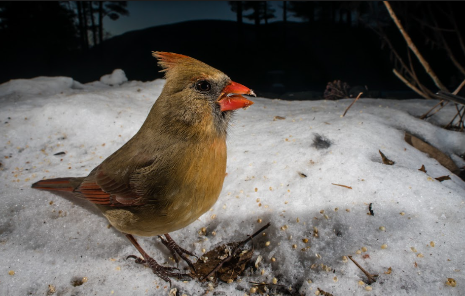 “As I got deeper into the project, intriguing observations emerged,” Rhodes says. “I noticed distinct repeat visitors such as a Dark-Eyed Junco with an overgrown beak, a deer mouse with a notched ear, and an irruption of Red-Breasted Nuthatches. Dark-Eyed Juncos always showed up at the crack of dawn and Northern Cardinals would always be the last visitor of the day as dusk turned into evening.”