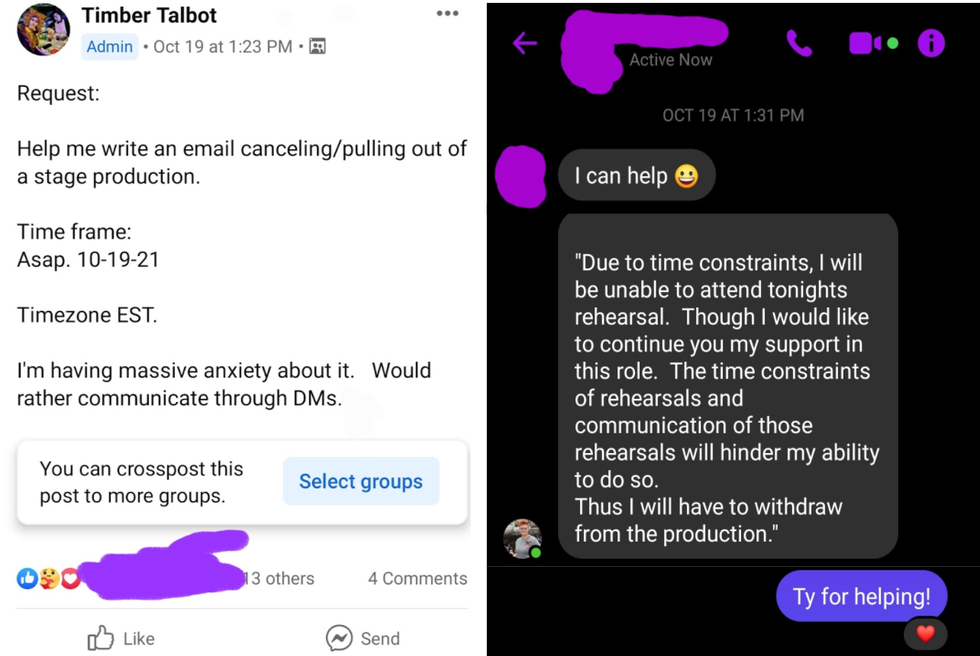 The Extra Spoons Group is a fantastic example of how people can use Facebook Groups to help one another in real-time. Here's an example of a group member helping Talbot write an email.
