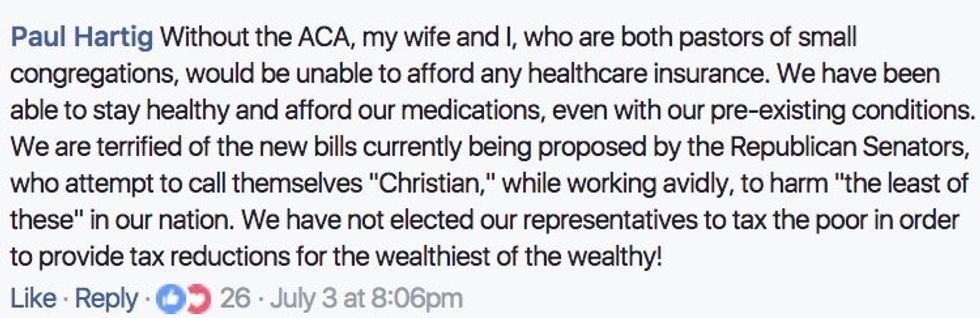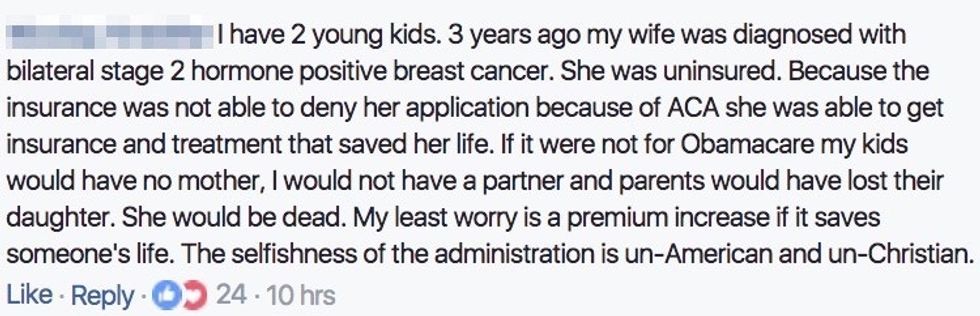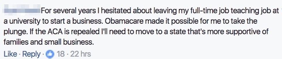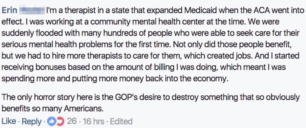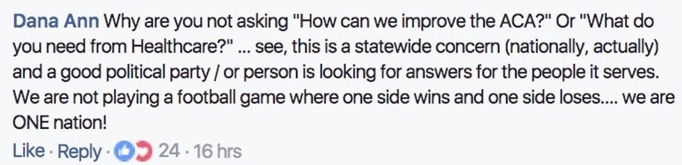And Facebook user Dana Ann nailed it with her comment about coming together for the sake of creating a health care system that works for all Americans, for all political parties. Lives are actually on the line, and it's time for our members of Congress to stop playing like this is a game.