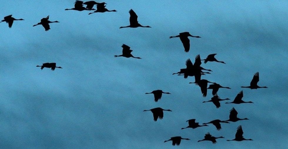Cranes fly at dawn. Photo by Francois Nascimbeni/AFP/Getty Images.