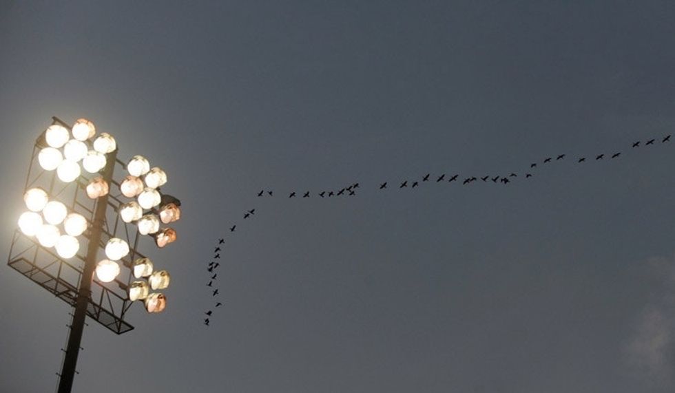 Birds fly past floodlights at the Punjab Cricket Association stadium in Chandigarh, India. Photo by Manan Vatsyayana/AFP/Getty Images.