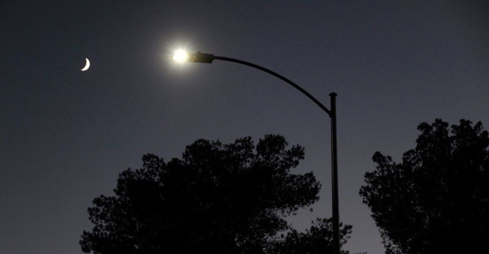 The moon behind a newly installed LED streetlight in Las Vegas. Photo by Ethan Miller/Getty Images.