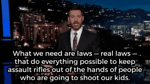 "What we need are laws — real laws — that do everything possible to keep assault rifles out of the hands of people who are going to shoot our kids," Kimmel said with tears beginning to well.
