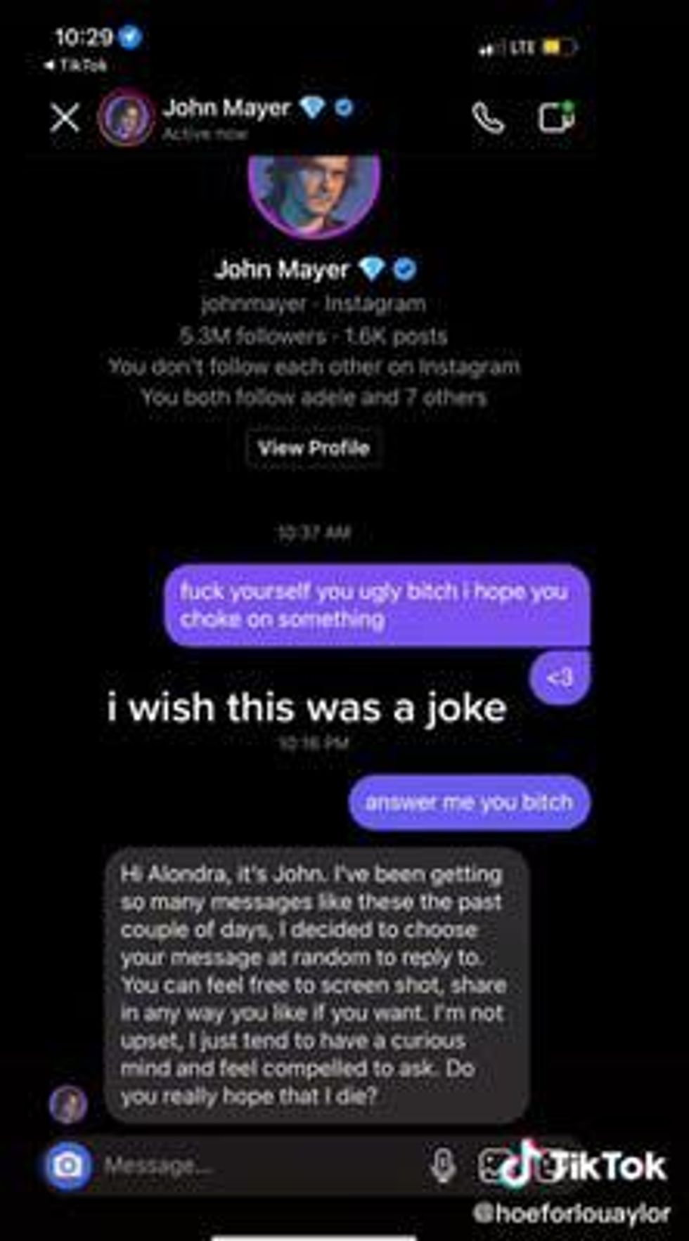 One Swiftie, who goes by the name @hoeforlouaylor on TikTok, wrote an extremely mean message to Mayer on Instagram.