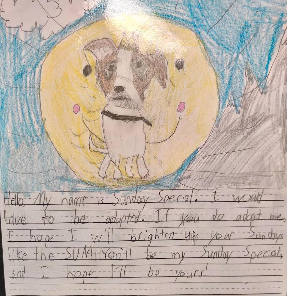 A letter written to hang on a dog named Sunday’s kennel reads: “I would love to be adopted. If you do adopt me, I hope I will brighten up your Sundays like the sun. You’ll be my Sunday Special, and I hope I’ll be yours!” Jones admitted she was surprised at what the kids came up with and that it “pulled at the heartstrings.”