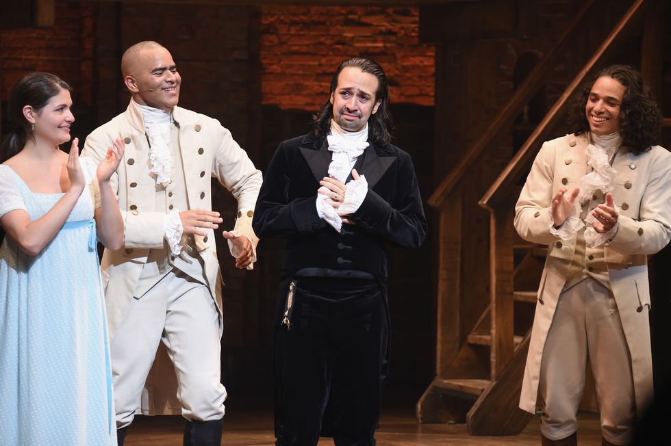 Miranda, center, at his final performance of "Hamilton" on July 9, 2016. Photo by Nicholas Hunt/Getty Images.