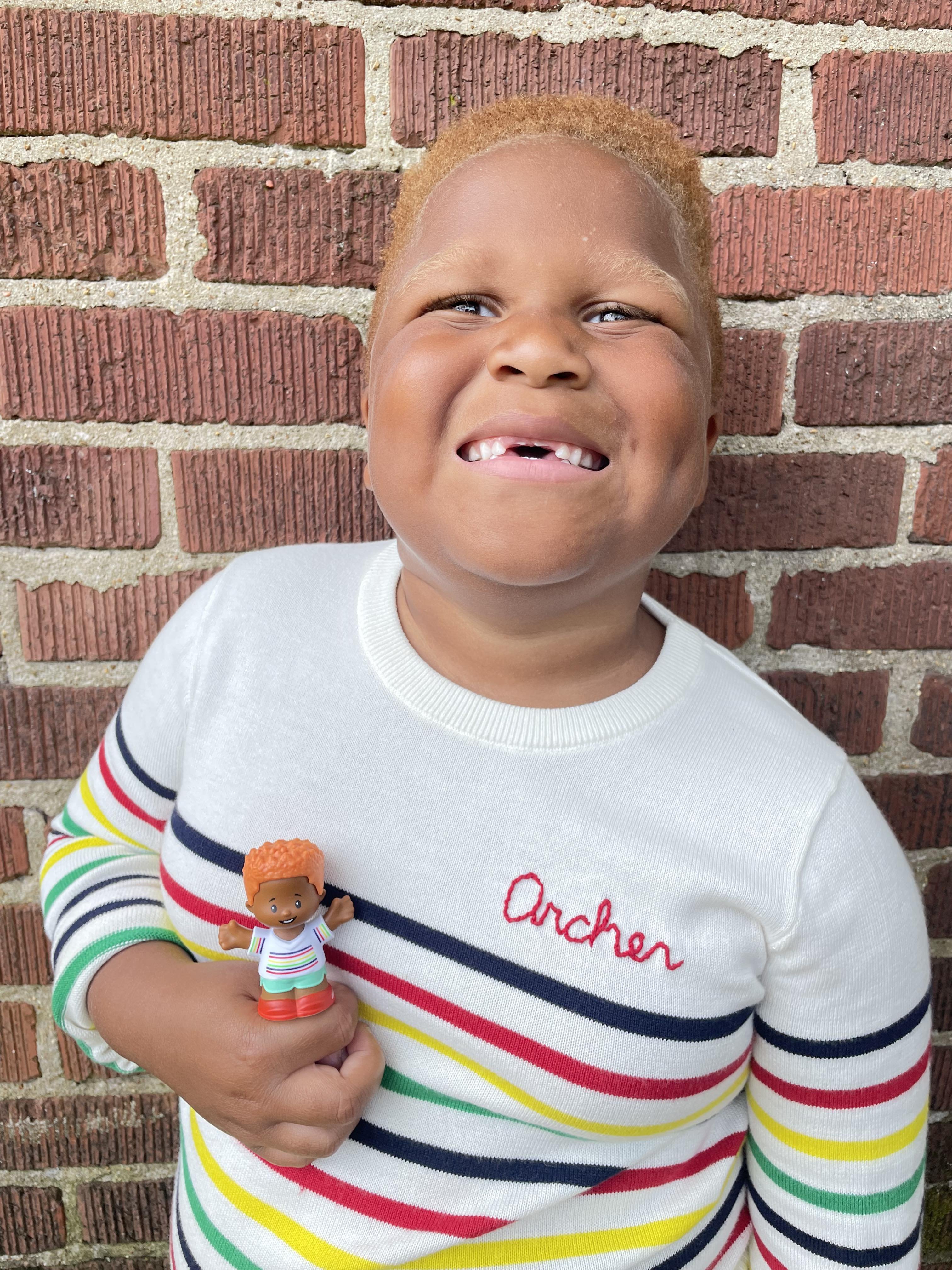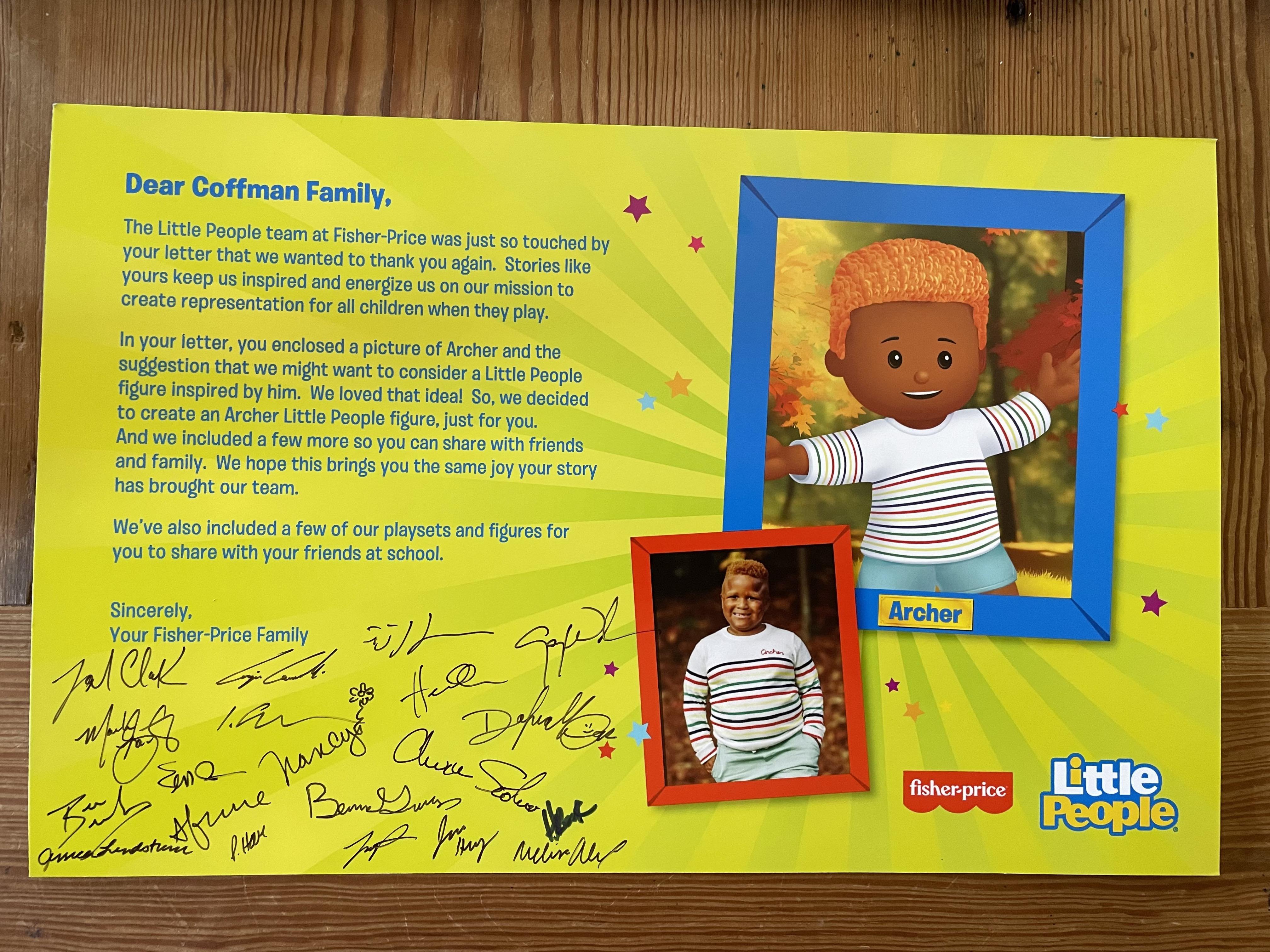 The VP ended the letter by asking for the family’s address, and shortly thereafter, a surprise for Archer arrived on their doorstep. Little People that looked just like the red-headed 5-year-old wearing a perfect replica of one of Archer’s outfits. The gift even came with a colorful letter with a picture of the boy inside that was signed by the entire Little People team.