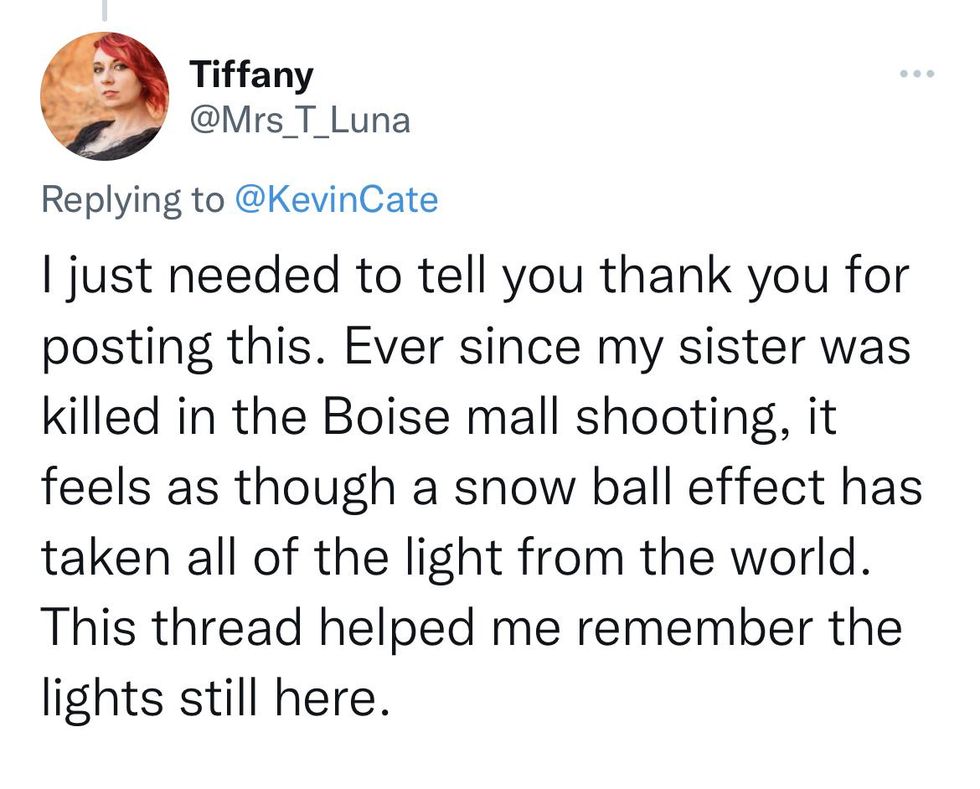 One commenter, Tiffany wrote, “I just needed to tell you thank you for posting this. Ever since my sister was killed in the Boise mall shooting, it feels as though a snow ball effect has taken all of the light from the world. This thread helped me remember the lights still there.”