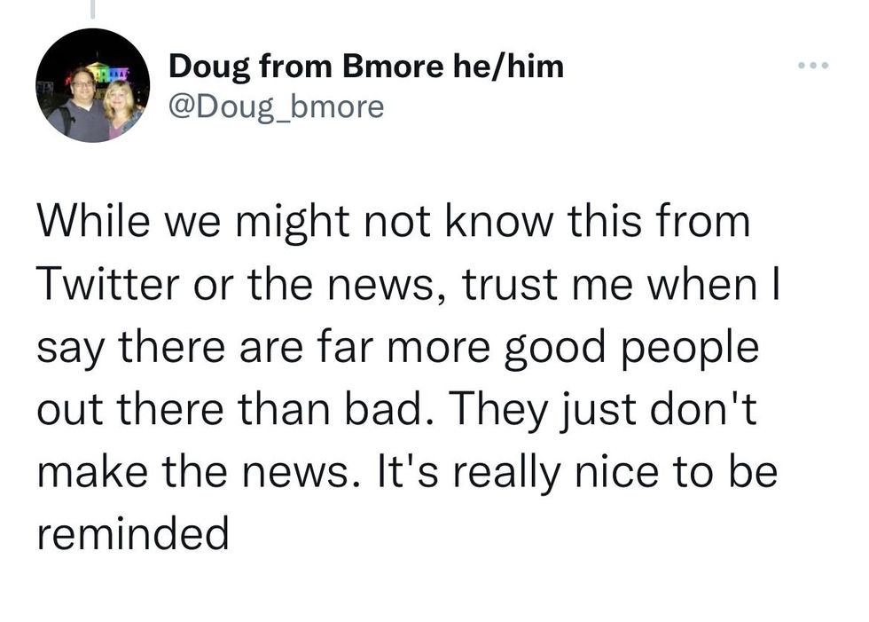 Another commenter, Doug, pointed out, “While we might not know this from Twitter or the news, trust me when I say there are far more good people out there than bad. They just don't make the news. It's really nice to be reminded.”