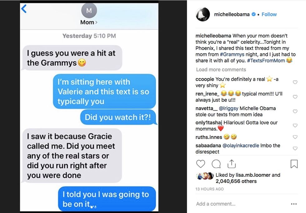 It's social media posts like this one that make people adore her realness—a quality she clearly gets from her mama. In an Instagram post captioned "When your mom doesn't think you're a 'real' celebrity...," Obama shared a text exchange with her mom after her surprise appearance at the Grammy Awards.