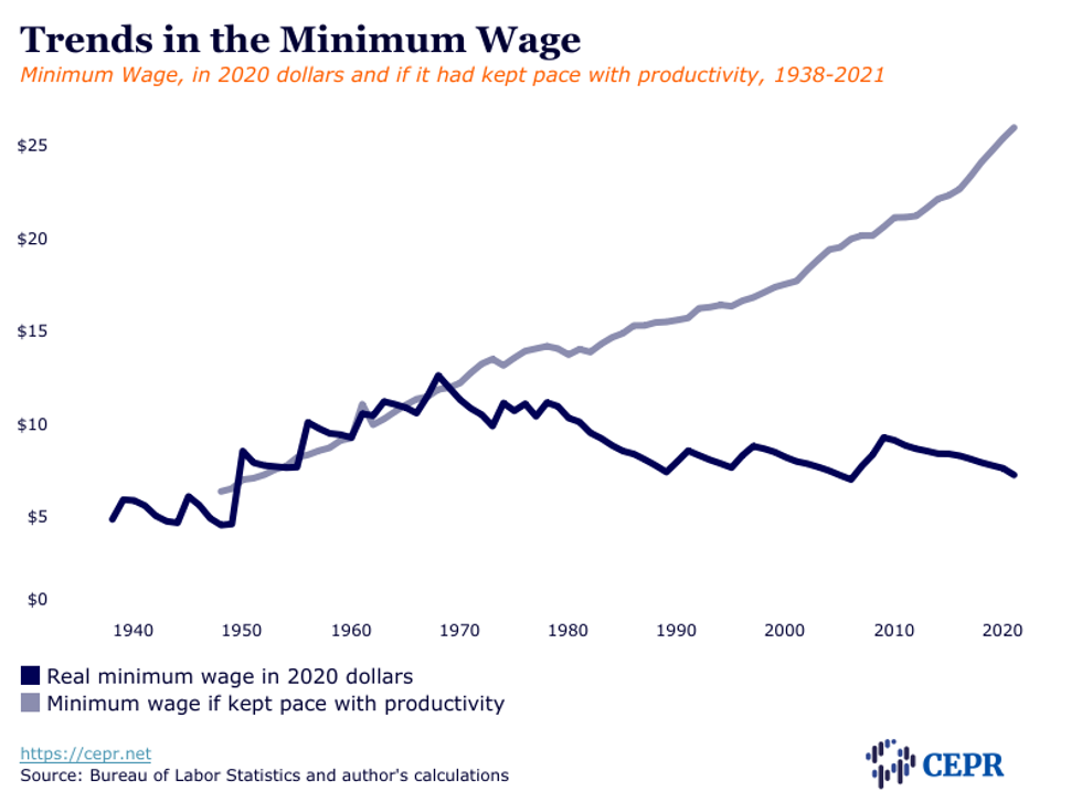 The federal minimum wage was first established in 1938 and Congress repeatedly raised the amount to correspond with U.S. productivity. In 1968 it was the equivalent of $12 in today's dollars. However, since 1968, U.S. productivity has dramatically increased, but the minimum wage has remained relatively stagnant.
