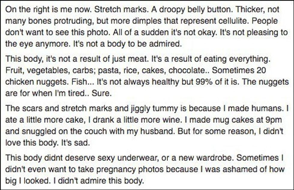 She posted a revealing before-and-after photos on social media and expressed how going from a rail-thin girl with a "high belly button" and "protruding bones" made her feel more valuable when she was younger. She also expressed how difficult it was to accept her new body after having three children.