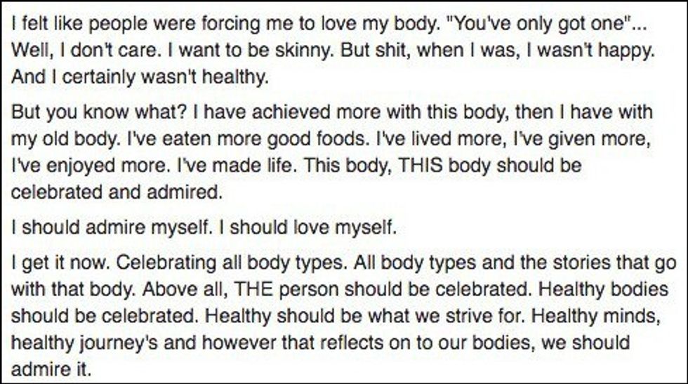 But Mazza eventually changed how she perceives her new body by appreciating all of the blessings it has given her. "I have achieved more with this body, than I have with my old body," she wrote. I've eaten more good foods. I've lived more, I've given more, I've enjoyed more. I've made life. This body, THIS body should be celebrated and admired."