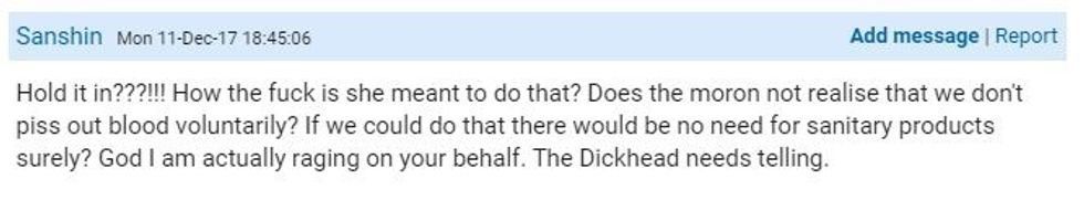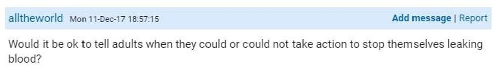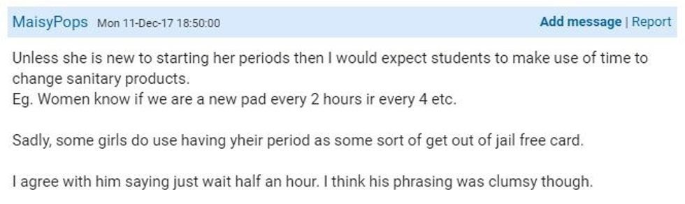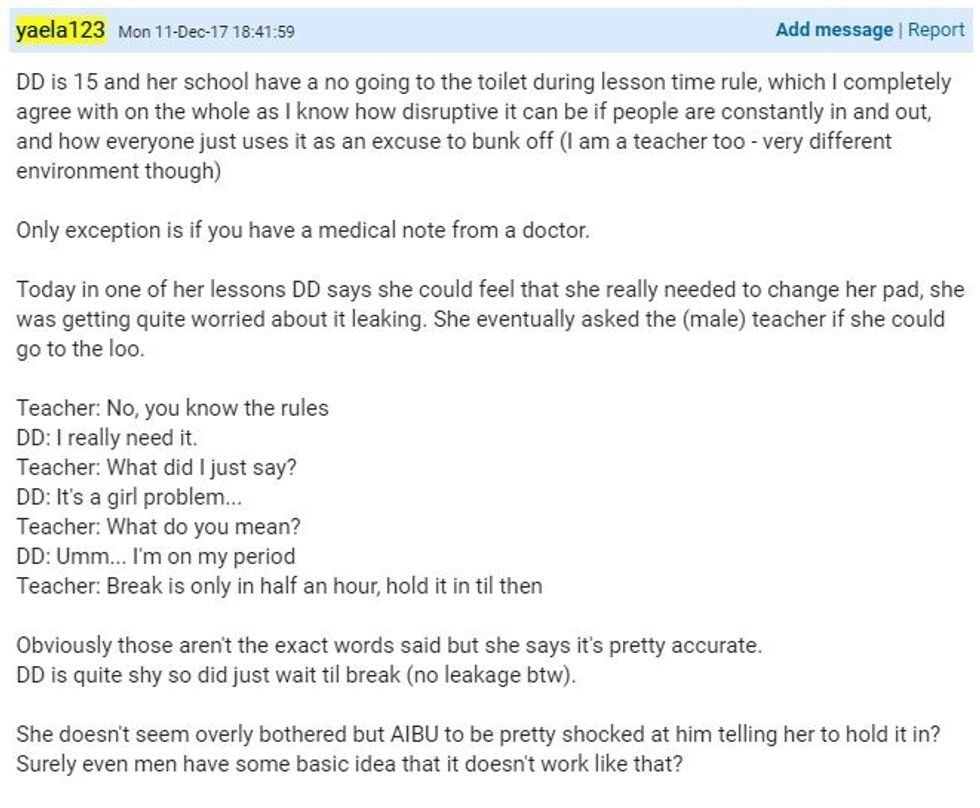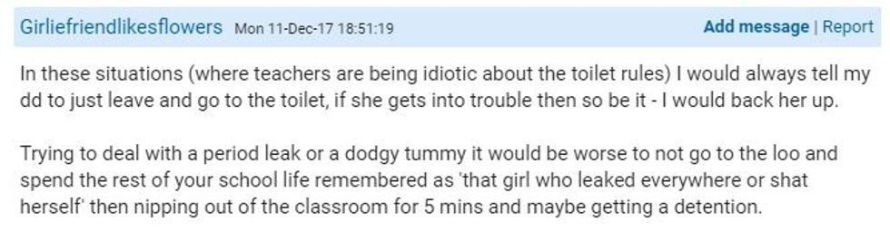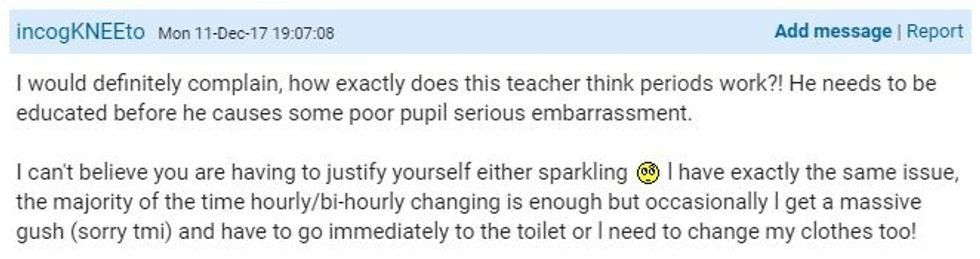 That's why a mother on the Mumsnet message board was completely "shocked" that her daughter's teacher told her to "hold in" her period.