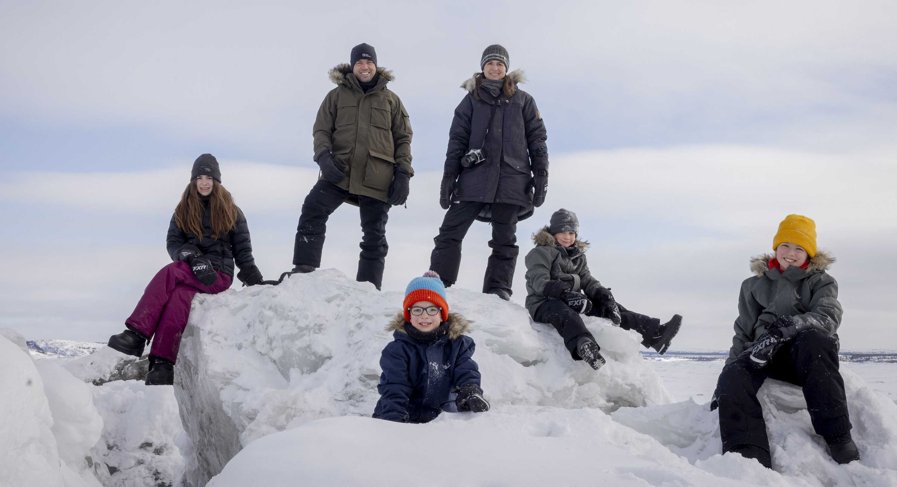Mia, Leo, Colin, and Laurent Pelletier pose on top of their camper van in front of adouble rainbow while in Mongolia.