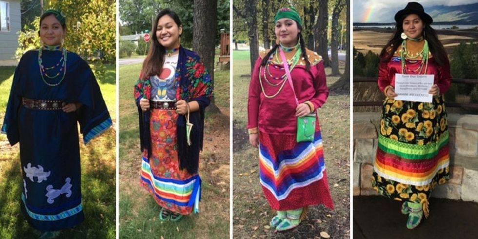 In fall 2016, GrowingThunder undertook a project to create and wear a different dress each day of her senior year of high school to honor native women who have been lost or killed.