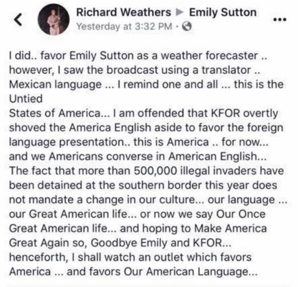 And if you need an even clearer example of a bad opinion, I offer up Richard Weathers for consideration. He got on local reporter Emily Sutton's case after seeing she delivered a weather broadcast that employed the use of a Spanish translator.