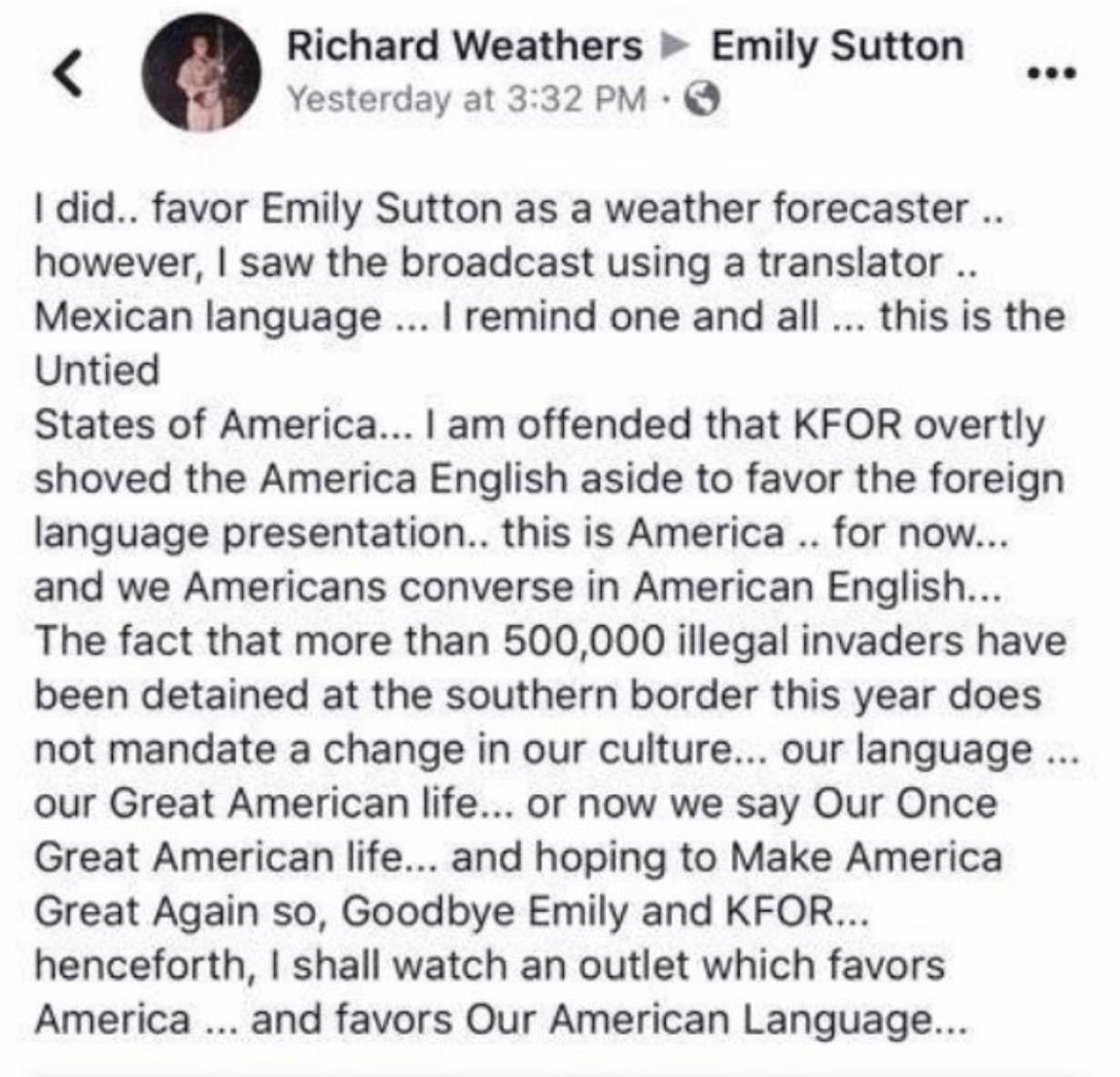 And if you need an even clearer example of a bad opinion, I offer up Richard Weathers for consideration. He got on local reporter Emily Sutton’s case after seeing she delivered a weather broadcast that employed the use of a Spanish translator.