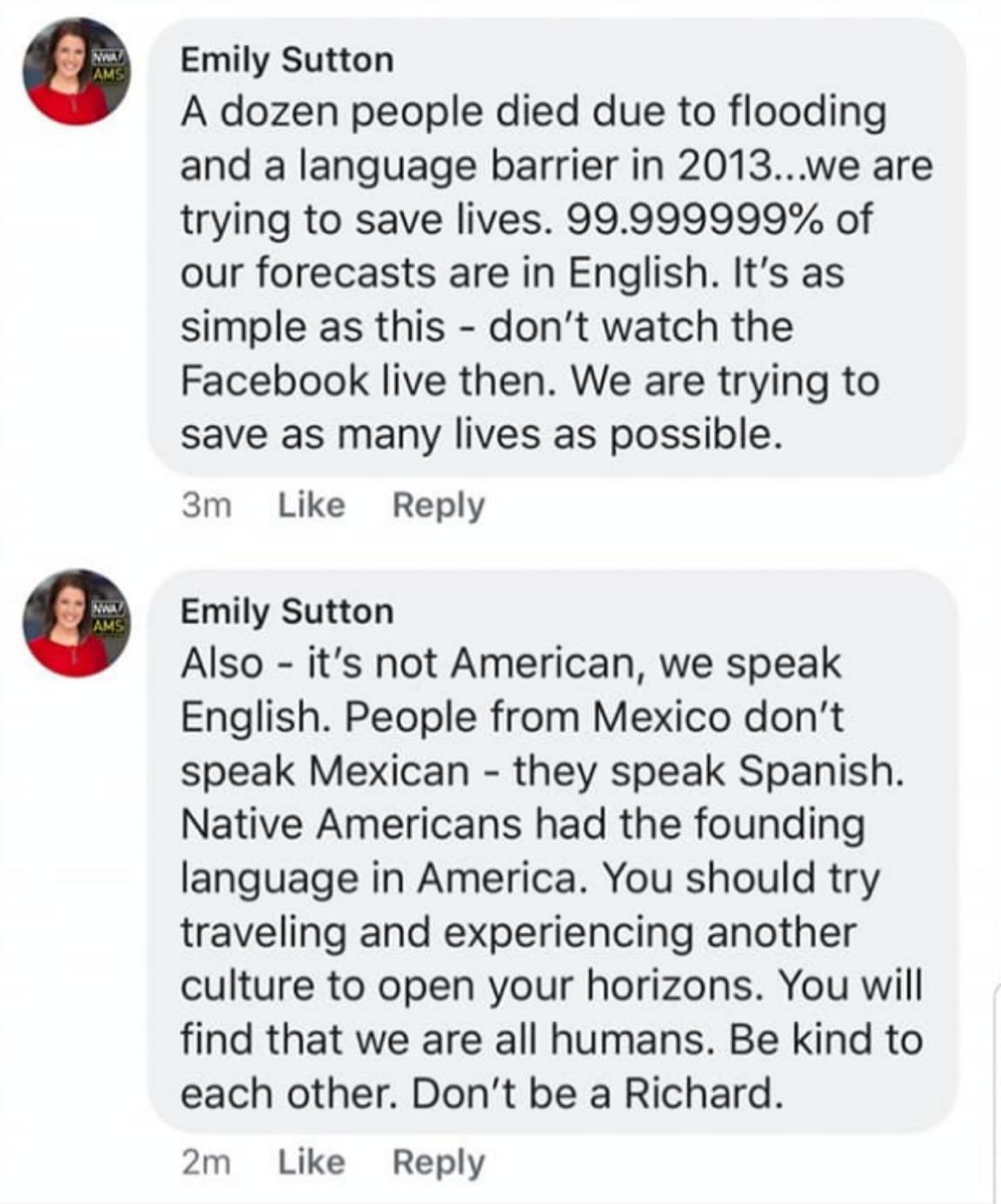 In a two-part response, she carefully explains the reason the sole purpose of having a bilingual broadcast was to save lives. In the second part, she highlights Richard’s inability to grasp that there is no language called “American” and suggests the become a bit more culturally aware.