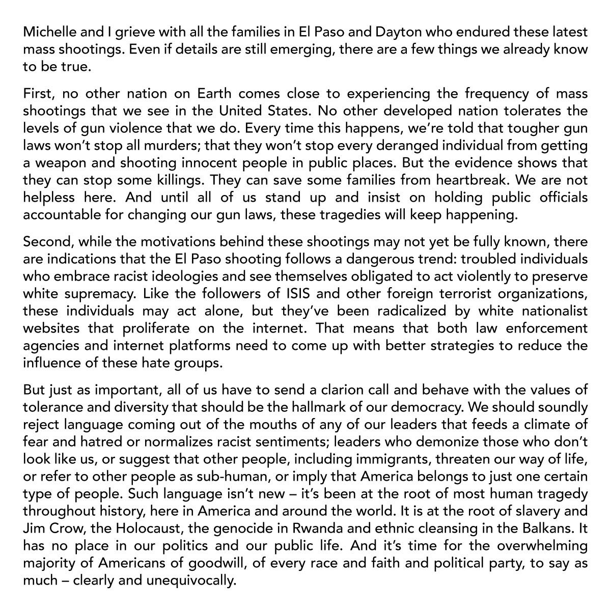 In the aftermath of the two gruesome mass shootings over the weekend, former president Barack Obama took to Twitter to console a grieving nation in a way that President Trump never could. Obama also called out Trump, without using his name, for helping to create a climate of fear and hatred: