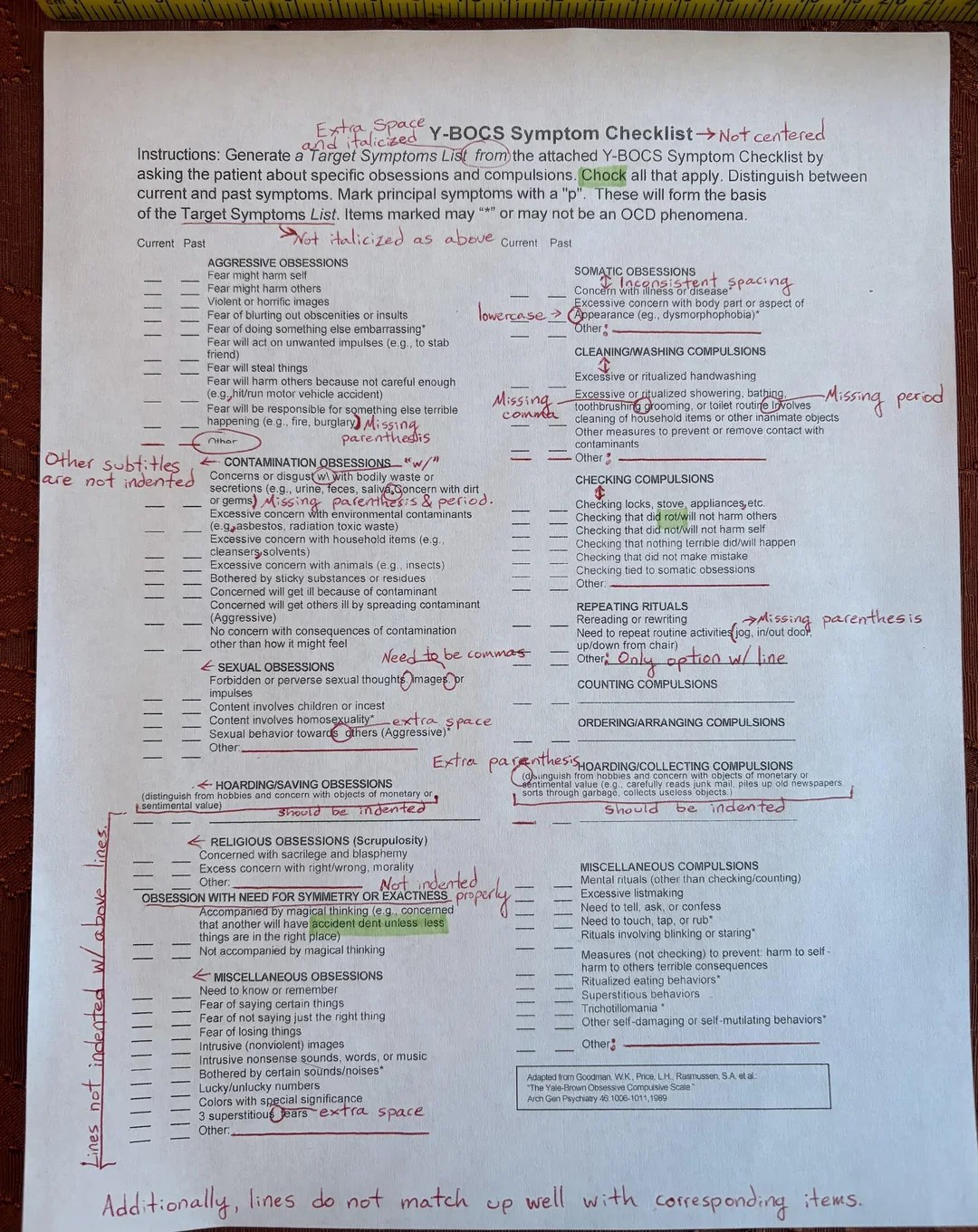 There’s something deliciously ironic about the OCD checklist being absolutely riddled with spelling and formatting mistakes.