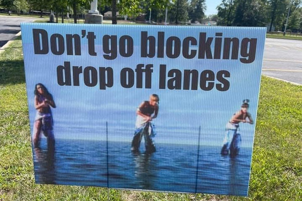 It's all in good fun about a minor inconvenience. Every parent wants their children to get to school safely, while feeling loved and ready for the day. Drop-off lane efficiency increases as the school year goes on because everyone is now used to the routine. But some parents will always need reminders, and having these signs will do just that.