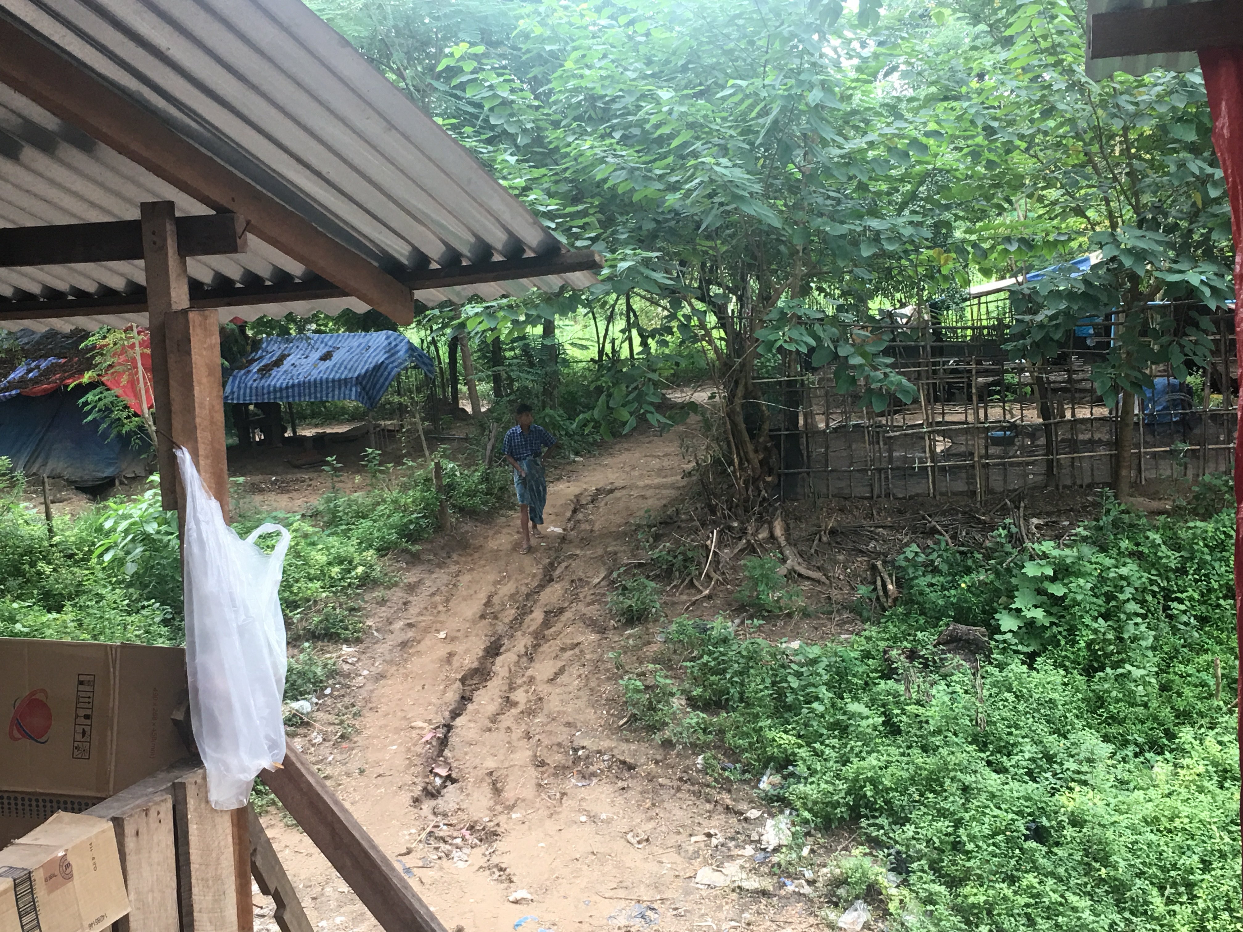 One morning, we go to the Thai/Burmese border, where a large, colorful marketplace sells clothes and trinkets, and a line of duty free shops sells mostly cigarettes. Pauline points out an area just beyond the shops, a strip of land between the countries known as “No man’s land.” Both countries claim jurisdiction over this area, but neither country effectively polices it. Hundreds of stateless Burmese people, including children, live here in makeshift huts made of plastic tarps draped over rudimentary wood structures. Though Thai soldiers loosely monitor it during the day, lawlessness, drug deals, and child exploitation go largely unchecked.