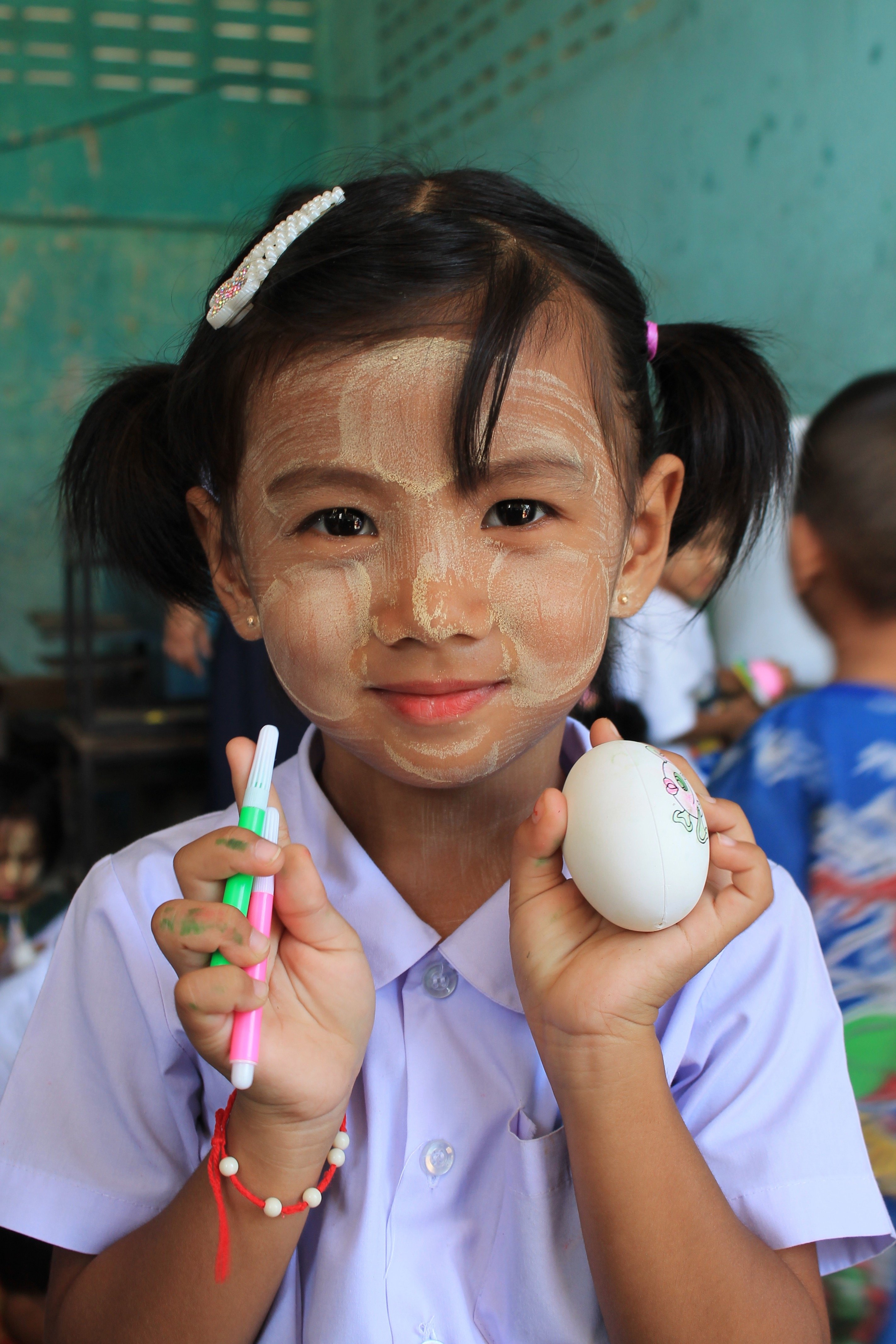 For three days, we throw birthday celebrations for about 430 kids, ranging in age from preschool to high school. I note that most of the kids wear some sort of school uniform, but some have put on their best dress-up clothes for the occasion. Most also wear a traditional skincare product called thanakha—a paste made of ground tree bark that’s used as a sunscreen and skin softener—on their faces. Burmese people of all ages wear thanakha daily, a distinguishing feature that makes them stand out in Thailand.