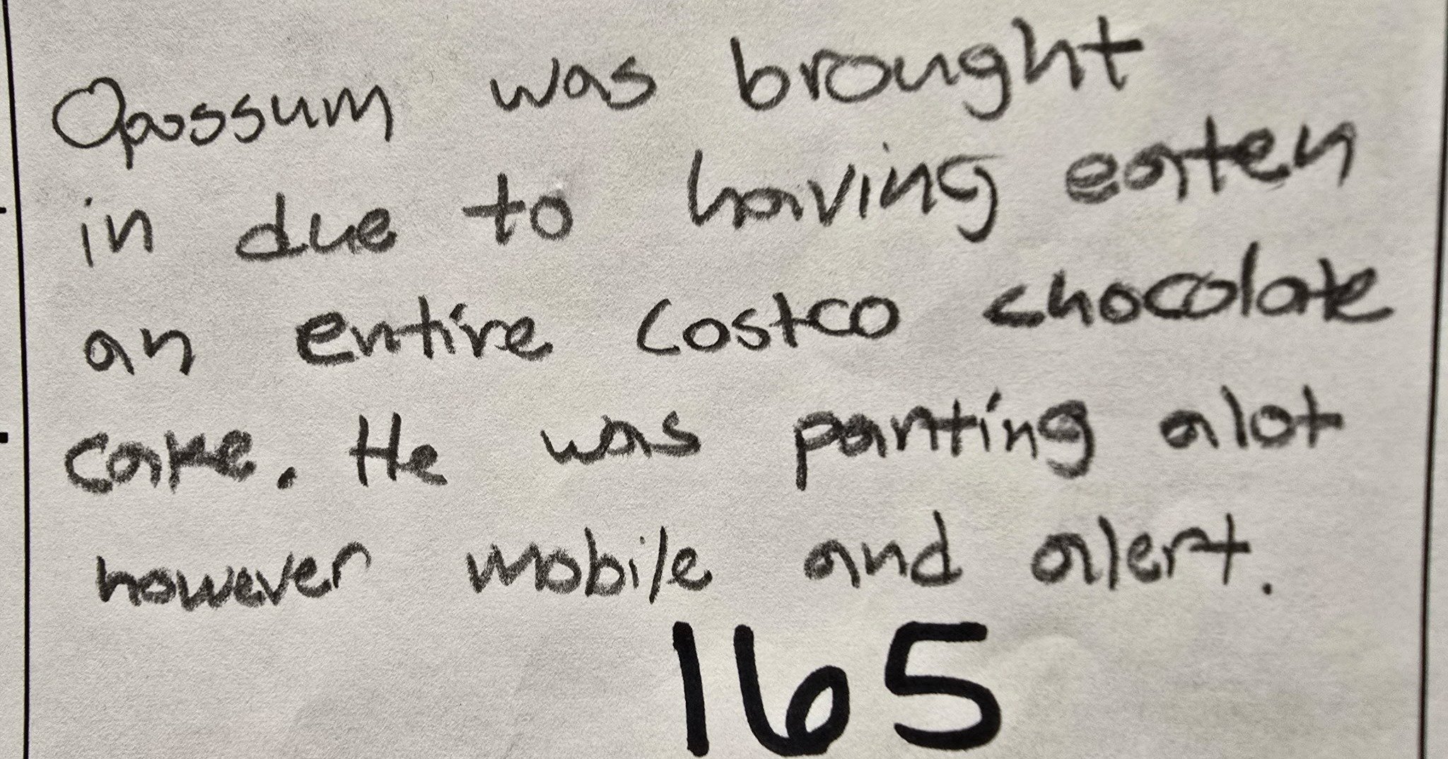 “Sometimes a sweet tooth just can’t wait until Valentine’s Day! This Virginia opossum was admitted today after reportedly devouring an ENTIRE Costco chocolate cake. With some time in rehab (and a diet reset), this choco-holic should be stabilized enough to return to the wild but until then, she is definitely a little cranky about our strict ‘zero chocolate’ policy! Same, opossum…. same.”