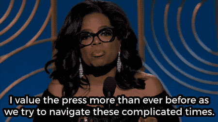 "We all know the press is under siege these days," she said, a thinly veiled criticism of a president hellbent on labeling information he doesn't like as "fake." "We also know it's the insatiable dedication to uncovering the absolute truth that keeps us from turning a blind eye to corruption and to injustice — to tyrants and victims, and secrets and lies."