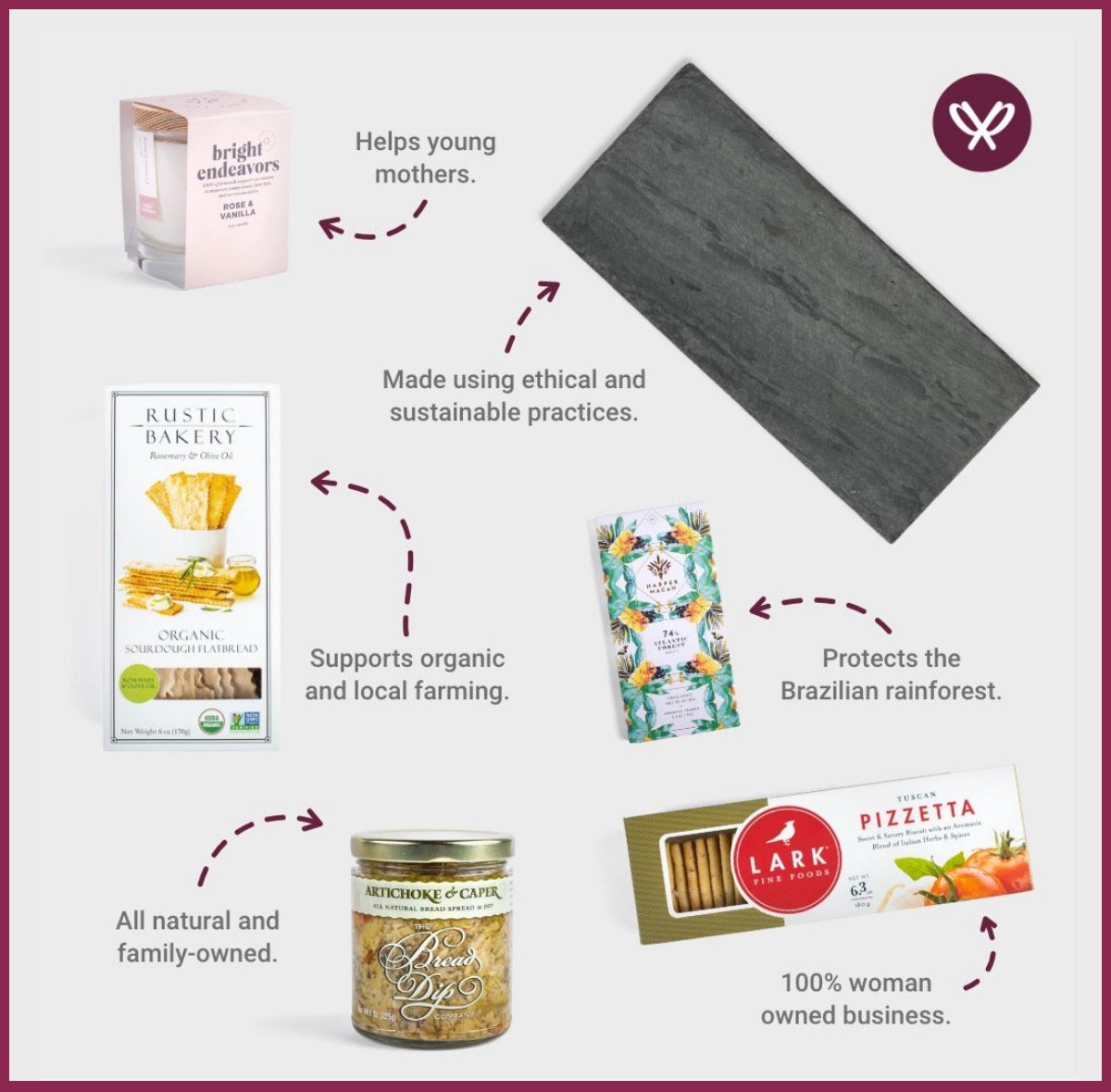 This process of careful curation to find companies like those mentioned above guarantees that every substitution, every item in every box, is of equal quality and impact. They understand that every product has a story, and with Packed With Purpose, each story is one of positive impact and purposeful change. And because of their commitment to environmental sustainability, all Packed with Purpose gift boxes and packaging is made from recyclable materials and printed on FSC-certified paper.