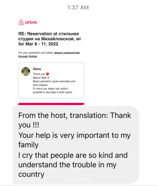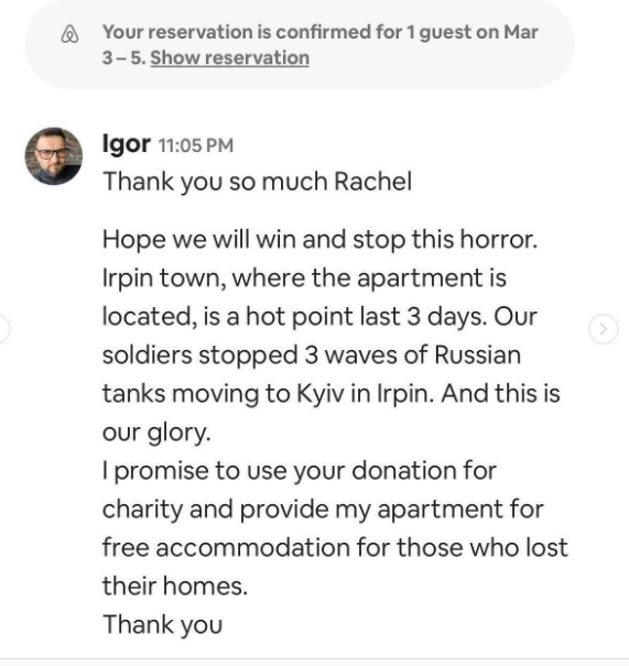For one, people are booking Airbnb stays in Ukraine for the coming days, which they obviously won’t be using, and telling the hosts to keep the money. When you book an Airbnb you can read the profiles and reviews of the hosts to get a sense of who they are, if they have children, etc. Some people rent out private rooms in their own homes, while others own property that they rent out, but it’s easy to see who you are renting from. When you book, you are also directly connected to the host so you can message each other.