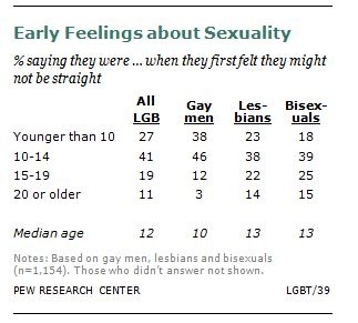 When it comes to gay, lesbian or bisexual people, the moment they realize they may not be straight happens at a median age of 12. Gay men tend to come to this realization a little earlier than lesbians or bisexuals with 38% reporting that they “were younger than 10 when they first felt they were not heterosexual.”