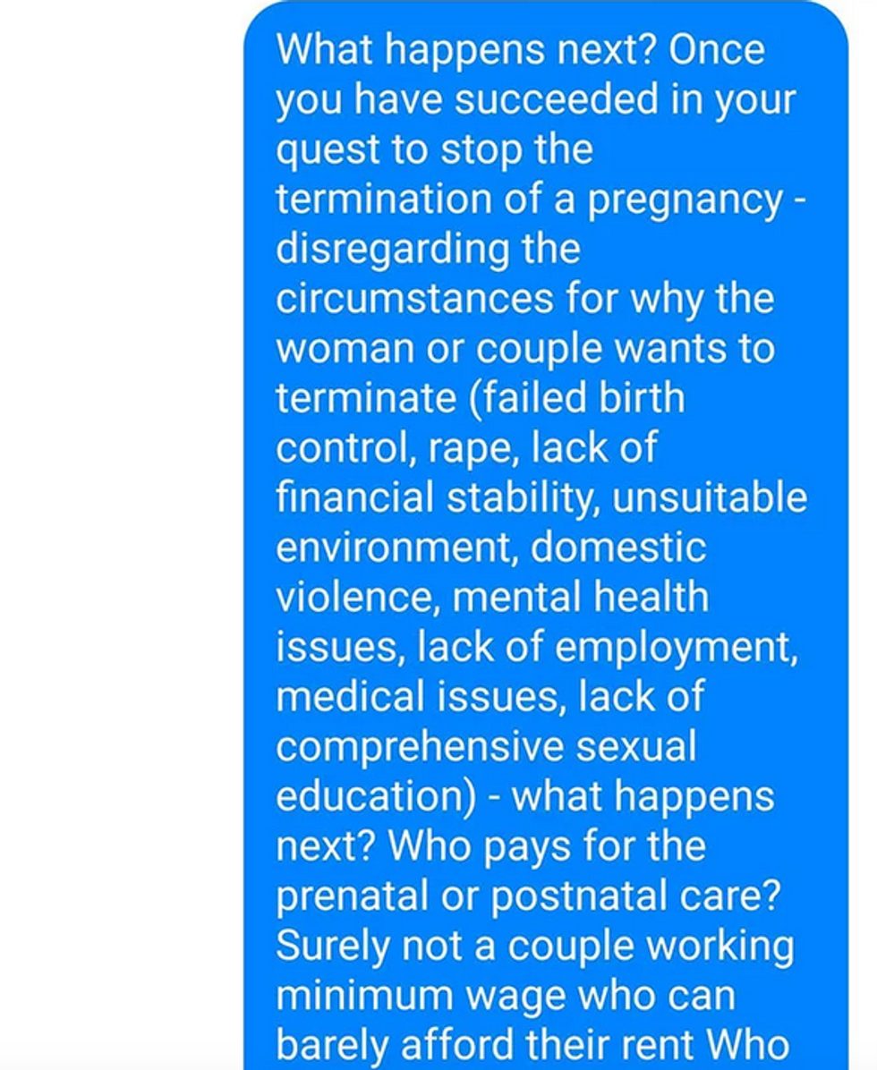 "Don't embarrass yourself and pretend that you give a flying fuck about what happens once a foetus is born, or about the people who aren't equipped to raise them. Don't pretend you give a shit about children when you aren't prepared to do a damn thing about the millions of struggling families on welfare, or the millions of children in foster care."