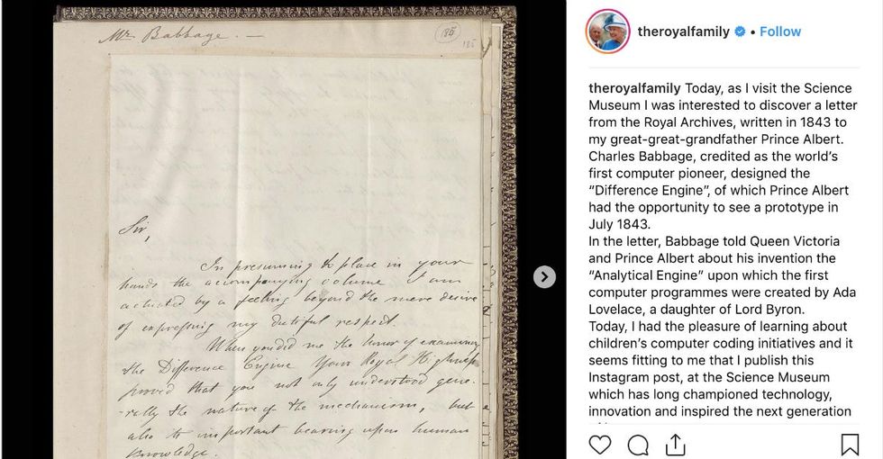 The Queen posted two photos of a letter to Prince Albert from Charles Babbage with a caption. "Today, as I visit the ScienceMuseum I was interested to discover a letter from the Royal Archives, written in 1843 to my great-great-grandfather Prince Albert,"theQueen wrote in her post.