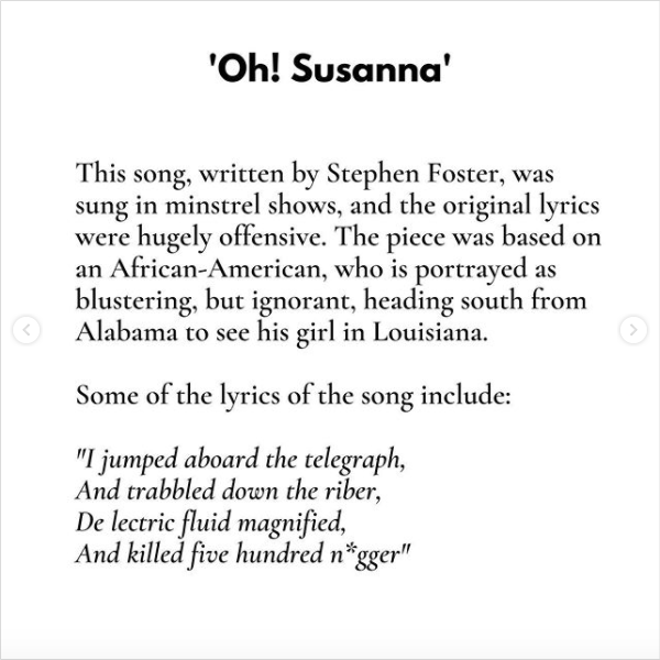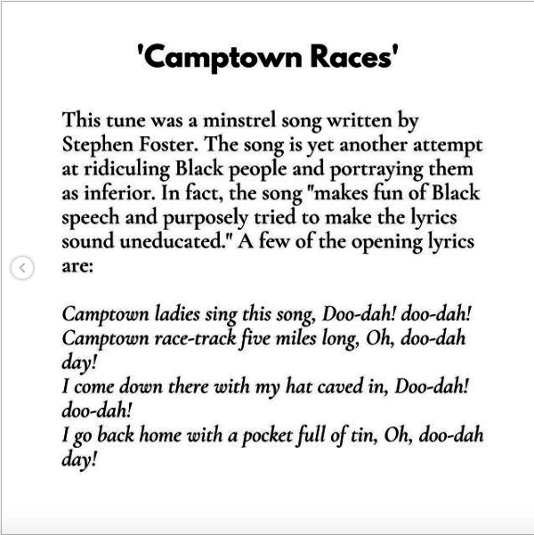 Finally, “Camptown Races.” Really? Yep. Again, from the blackface minstrel era, a song that basically made fun of Black people.