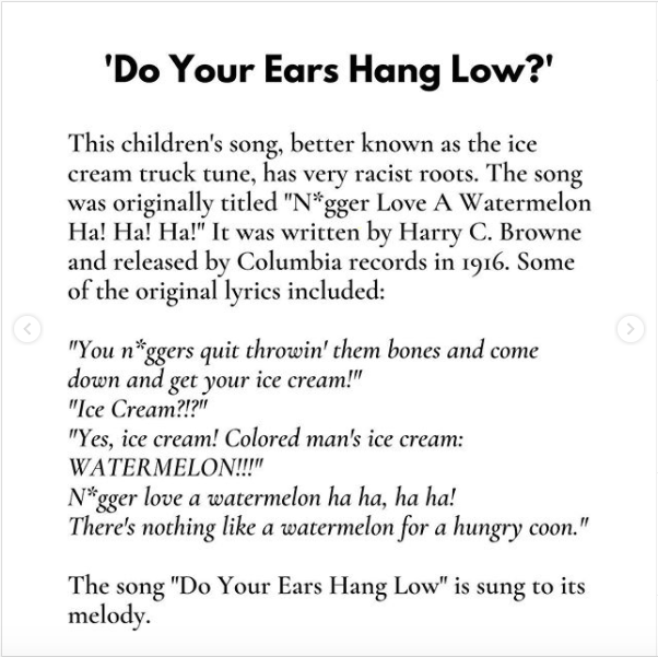 And then there’s the ice cream truck song. The familiar tune that’s synonymous with summer—also sung by kids as “Do Your Ears Hang Low”—was originally a song called “N****r Love a Watermelon Ha! Ha! Ha!” Yeah.