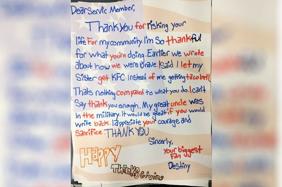 Thank you for risking your life for my community. I'm so thankful for what you're doing. Earlier we wrote about how we were brave. I said I let my sister get KFC instead of me getting Taco Bell. That's nothing compared to what you do. I can't say thank you enough. My great uncle was in the military. It would be great if you would write back. I appreciate your courage and sacrifice. Thank you. Happy Thanksgiving.