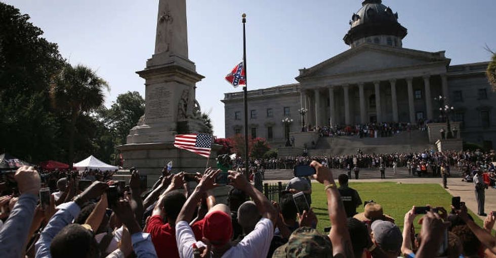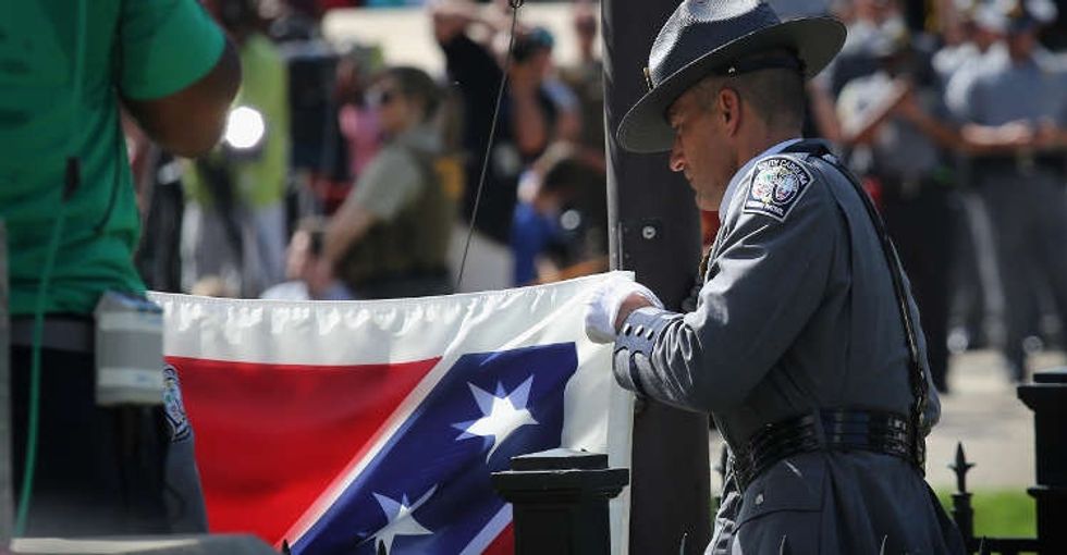 The Confederate flag is lowered at the South Carolina statehouse. Photo by John Moore/Getty Images.