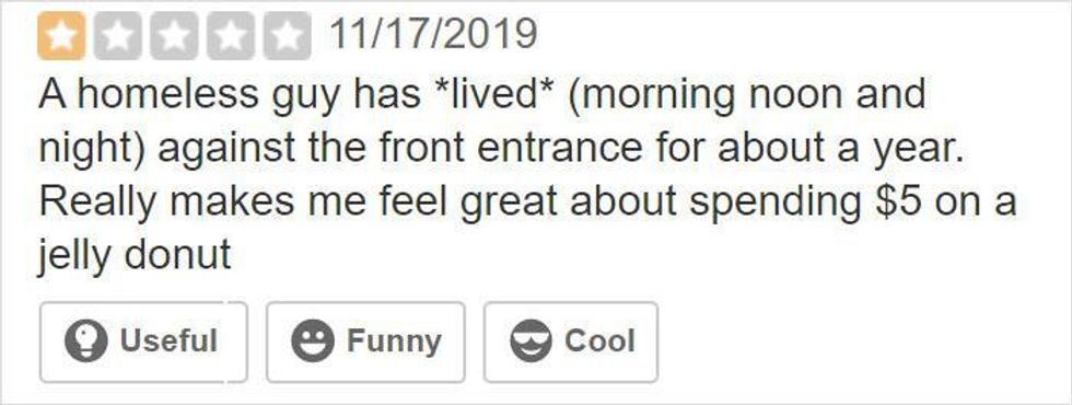 The exchange was spotted by Reddit user beerbellybegone on Reddit, who shared screenshots on the social media site. The one-star review by the angry customer states: "A homeless guy has *lived* (morning noon and night) against the front entrance for about a year. Really makes me feel great about spending $5 on a jelly donut."