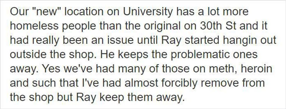 Brad continues: "Our 'new' location on University has a lot more homeless people than the original on 30th St and it had really been an issue until Ray started hanging out outside the shop. He keeps the problematic ones away. Yes we've had many of those on meth, heroin, and such that I've had to almost forcibly remove from the shop but Ray keeps them away."