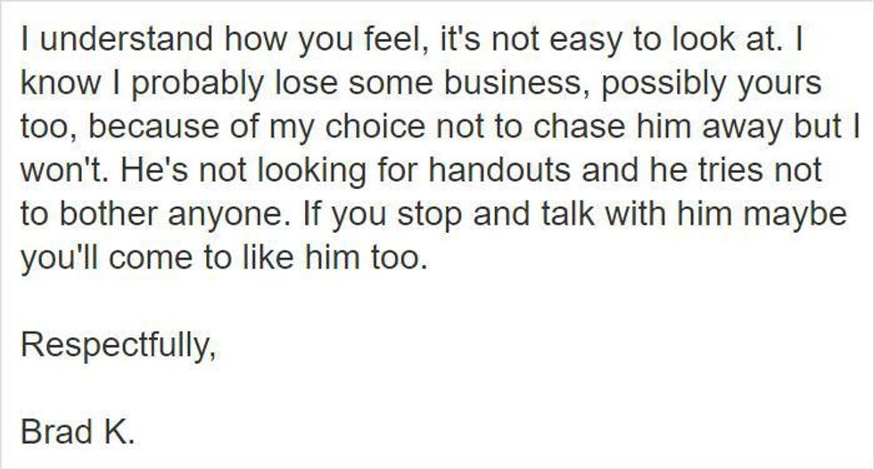 Brad concludes: "I understand how you feel, it's not easy to look at. I know I probably lose some business, probably yours too, because of my choice not to chase him away but I won't. He's not looking for handouts and he tried not to other anyone. If you stop and talk with him maybe you'll come to like him too."