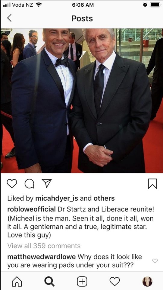 You are rich and famous actor, Rob Lowe, posing with another rich and famous actor, Michael Douglass. You’re both dressed to the nines at a red carpet event with other rich and famous people milling around behind you.