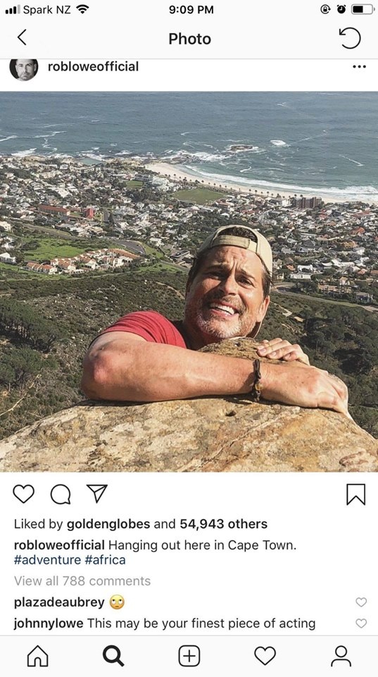 Speaking of burn, this swipe at Lowe’s acting is hilarious. As Lowe appears to be hanging precariously from a clip outcropping with the cheezy caption, “Hanging out here in Cape Town,” John writes, “This may be your best piece of acting.”