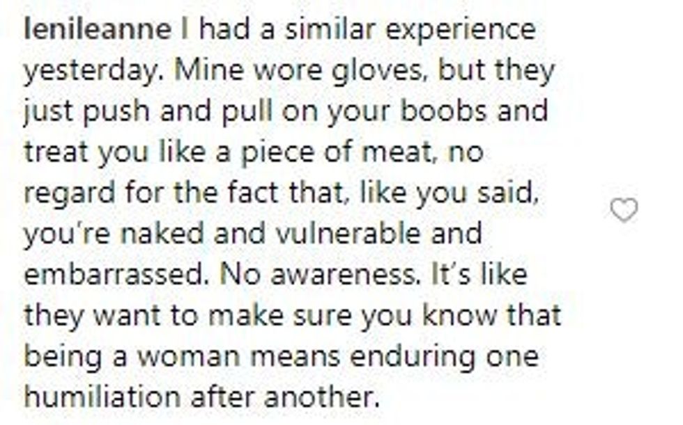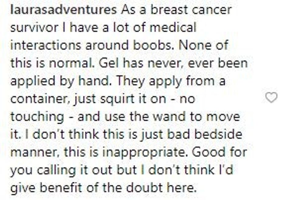 He opened my gown and put gel on my breasts and smeared it around with his bare hands. Then he started talking to me about my chest X-ray (I also got a chest X-Ray) and was pontificating with my boobs just out and covered in gel and cold and finally I said “Hey-can we either talk about this when I'm dressed or WHILE your doing the ultrasound? I'm not comfortable with my breasts out just shooting the shit with you"