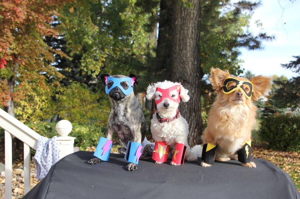 Dog members of the Compassion Crew, Scarlett (left) Roy (center), and G.I. Joe (right).