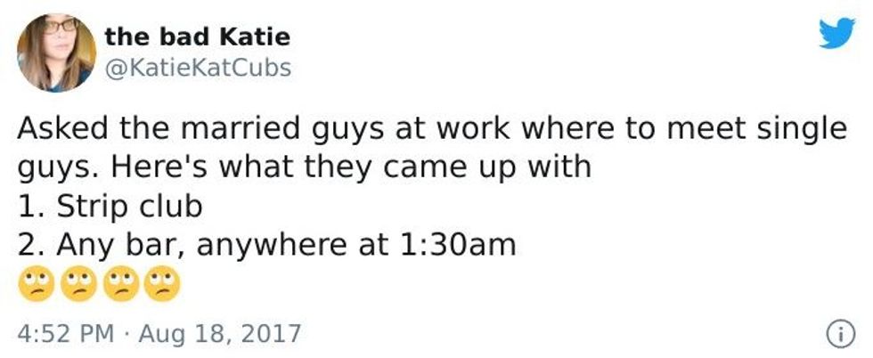 Our story begins three years ago when a gal named Katie living in Iowa posted some terrible advice she received from her married coworkers about where to find single men.